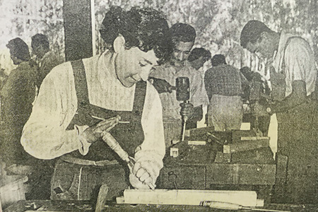 Elena Kazmer en el taller de carpinteria